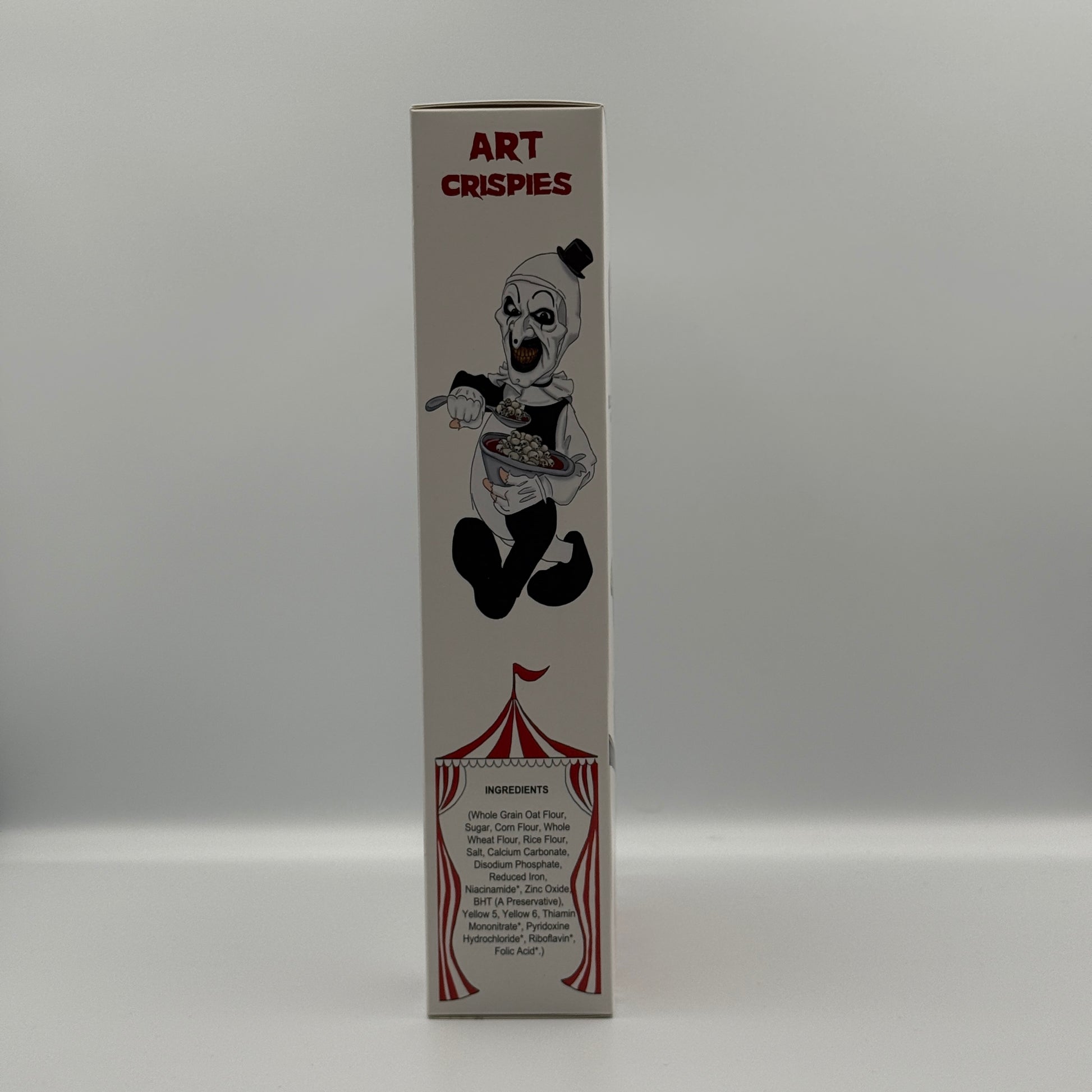 These rare boxes are replicas of the Art Crispies cereal box as seen in the movie Terrifier 2 and were made by Damien Leone.
